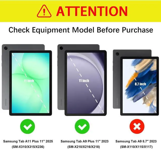 CompatibilitySpecially Designed for All-New Samsung Galaxy Tab A11+ Plus 11" 2025 (SM-X310/X315/X236)/ Samsung Galaxy Tab A9+ Plus 11" 2023 (SM-X210/X216/X218). Please check your device model. ^^ Superior Quality CasePremium Synthetic Leather with microfiber cloth combine with rigid polycarbonate back shell brings you a solid case, will perfectly protect your tablet from knocks, dust, damage, scratches. ^^ Stand DesignConvenient stand position for watching movie or typing, and offer a cozy angle to view and let your hands free. Magnetic smart cover supports fast response auto sleep/wake function. ^^ Perfect CutoutsWith precise cutouts of speaker, camera, buttons and other ports, full access to all controls and features.
