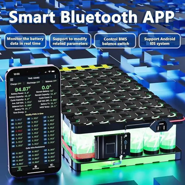 Easy Connection: Monitor and manage your battery system effortlessly with the "JK BMS" app for Android and iOS. Bluetooth connectivity provides real-time access to battery status, settings, and controls from your smartphone ^^