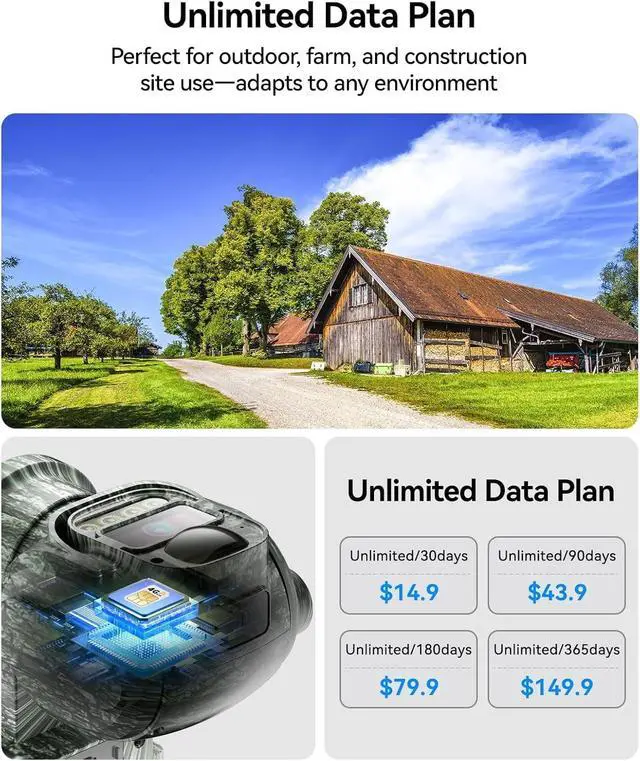 4G LTE Connectivity, No WiFi RequiredThis 4G LTE cellular security camera is built for remote monitoring in areas where WiFi isn't available. As a wireless camera no internet needed, it's ideal for farms, cabins, barns, or job sites. The camo design blends seamlessly into forests, while the IP65 housing ensures the no wifi security camera outdoor stays active through rain and snow. ^^ Unlimited Data with Built-in SIM CardThis cellular security camera comes with a built-in SIM card and trial datano need to replace or insert your own. Choose unlimited data at $ 14.9 /month or $ 149.9 /year, and enjoy peace of mind with a security camera no internet needed and no extra fees.