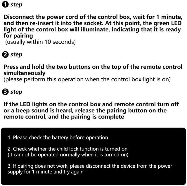 STEP 3: press and hold the Head Up, Foot Up buttons buttons or 30 seconds to complete the pairing ^^ Precise ControlThe optimal control distance between the device and the remote control is five meters, and the maximum distance is ten meters. ^^ Excellent After- Sale ServiceNo matter if you have any questions about product features, order details, or need any other assistance, simply contact our dedicated customer service team. We guarantee a rapid response within 12 hours on working days and strive to solve any problems efficiently.