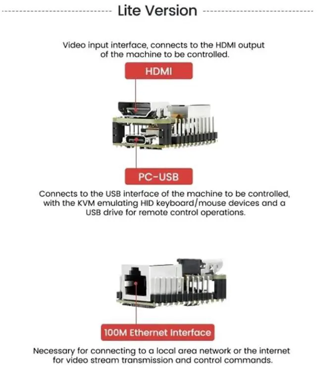 machine: NanoKVM gets rid of the limitations that the host computer must be connected to the Internet and the system software, and can be used as the external hardware of the host computer to provide the function of remote control directly. ^^ Meet the different needs of usersNanoKVM Lite is the basic version of the configuration, suitable for individual users with a certain degree of DIY ability and batch demand for enterprise users;