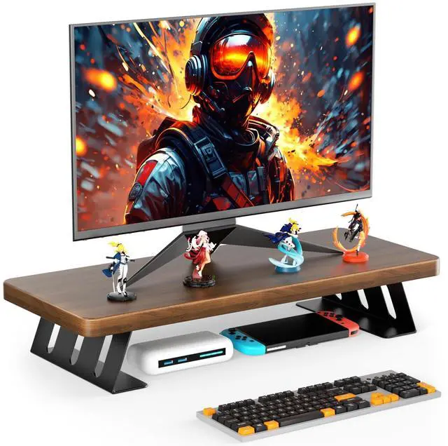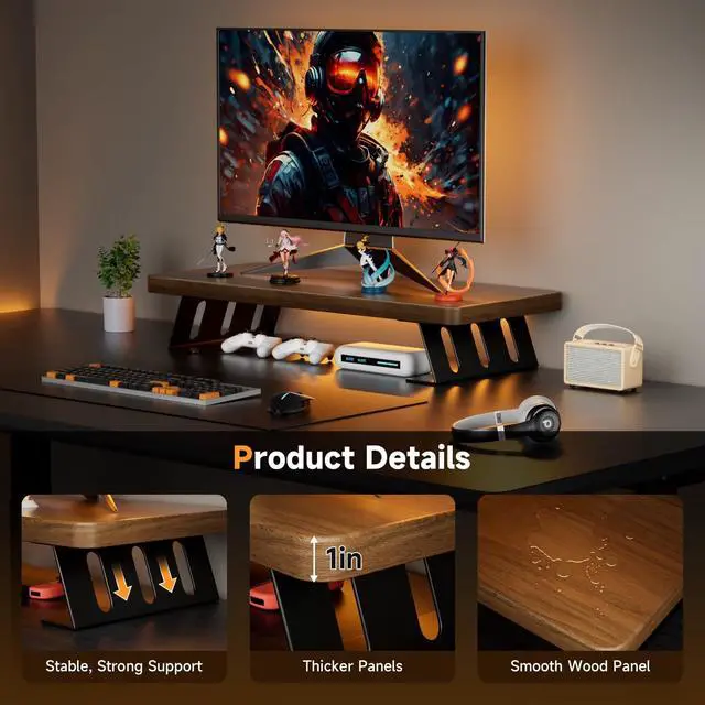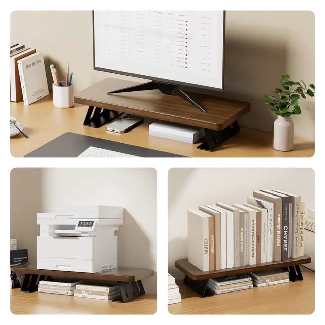 ^^ Strong & Sturdy ConstructionCrafted with high-quality thickened panels and a heavy-duty steel base, our monitor stand provides exceptional strength and stability, easily supporting up to 220 lbs without any risk of collapse or shaking during use. ^^ Quick & Easy Assembly Assembly is a breeze! Our computer monitor riser features pre-drilled holes, allowing you to effortlessly screw in the 4 brackets and install your dual monitor riser in just 2 minutes. ^^ Multifunctional StandMore than a monitor riser: use it as a laptop stand, printer base, game console shelf, or streaming box organizer. Its versatile design helps declutter any desk, making it perfect for home offices, studios, and professional setups