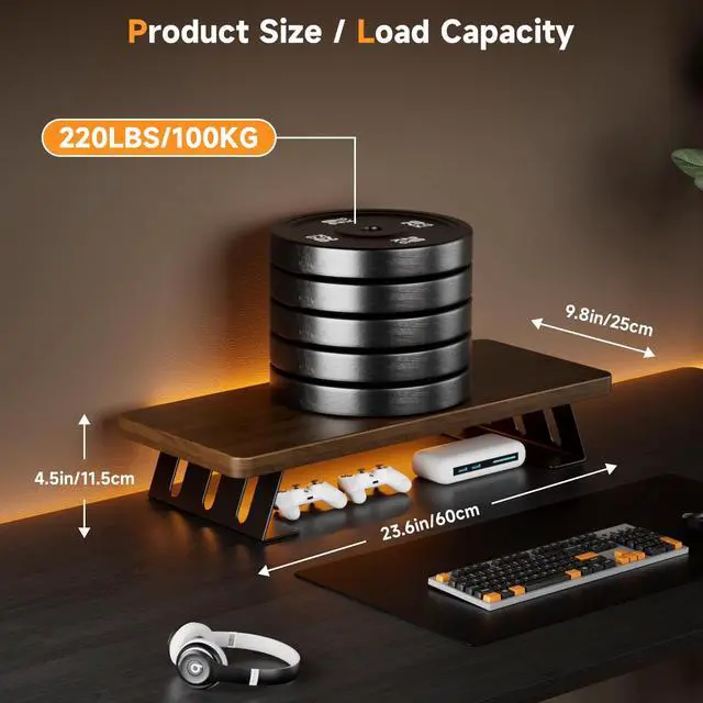 Ergonomic Monitor Riser for DeskNestNeat Monitor Stand elevates your monitor to the optimal eye level, actively reducing neck strain and improving posture. This ergonomic alignment promotes longer, more focused work sessions while minimizing physical fatigueperfect for remote work, gaming setups, and professional office environments. ^^ Maximize Storage & Save SpaceThe sleek monitor stand measures 23.6" x 9.8" x 4.5", designed to do more than just elevate your screen. It creates an organized storage zone underneath that instantly transforms your desk, giving you more usable space while keeping everyday essentials neatly tucked away.