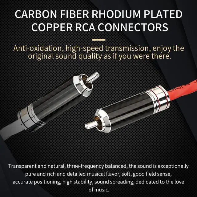 [Silver-plated Copper] The core of this tonearm cable is silver-plated copper, has high transmission efficiency, signal fluctuations are smaller, the sound is transparent, rich in detail, three frequency balance, high analytical ability, and an outstanding sense of volume. Low-frequency dive is good, the sound field is wide, which can make up for the lack of sound field; High and medium frequencies are softer and sweeter, have excellent resolution, and vocal transparency, and significantly improve the sound density and high-frequency extension; Low and medium frequencies and speed response are rhythmic and elastic, bringing high analytical ability and strong dynamics ^^ [Rhodium-plated Copper RCA Connectors] Viborg's turntable tonearm cable with rhodium-plated copper RCA connectors, anti-oxidation, high-speed transmission, enjoy the original sound quality as if you were there.