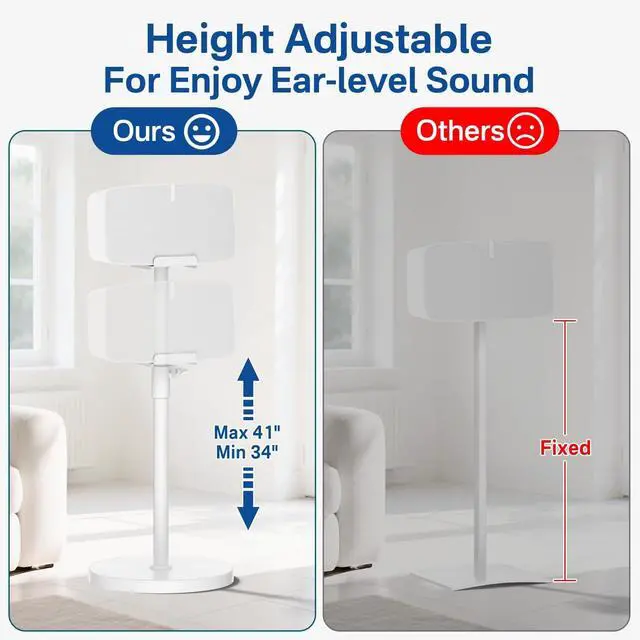 ^^ Height Adjustable: Tool-free adjust your surround sound speaker stand for Sonos Play 5 from 34" to 41" for true ear-level precision. Engineered for home theater enthusiasts, this flexibility ensures optimal audio projection whether seated or standing, transforming any room into a professional listening space.