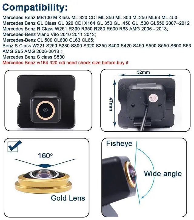 Dear customer, Please must check the camera size and appearance before place a order, see if can fit your car license plate lamp place size and appearance! Because the same car model in different countries may have some difference, please check the camera size and compare the installation of your car carefully to avoid mistake. This product could fit for all below models as expected: Replacement for Mercedes Benz MB100 M Klass ML320 CDI ML350 ML300 ML250 ML63 ML450; Mercedes Benz GL Class GL320 CDI X164 GL350 GL450 GL500 GL550 20072012; Mercedes Benz R Class W251 R300 R350 R280 R500 R63 AMG 2006 - 2013; Mercedes-Benz Viano Vito 2010 2011 2012; Mercedes-Benz CL500 CL600 CL63 CL65; Benz S Class W221 S250 S280 S300 S320 S350 S400 S420 S450 S500 S550 S600 S63 AMG S65 AMG 2006-2013; Mercedes Benz S class S500 Mercedes Benz w164 320 cdi-