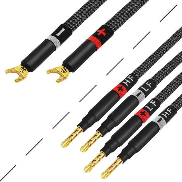 WORLDS BEST CABLES 3 Foot Ultimate - 9 AWG - Ultra-Pure OFC - Premium Audiophile HiFi Bi-Wire Speaker Cable for Center Channel - Eminence Gold Spade (x2) & Banana (x4) Plugs & Carbon Tweed Jacket