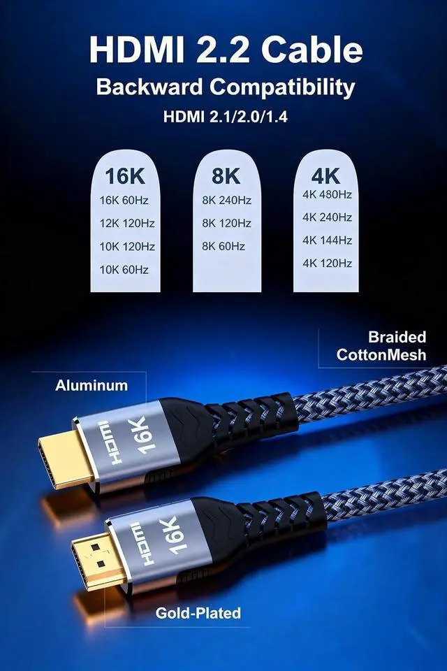 This Ultra High Speed HDMI 2.2 Cable is the ideal choice for an ultimate audiovisual experience. It supports 16K@60Hz and 12K@120HzIt supports 8K@60Hz and 4K@120Hz/240Hz high refresh rates, fully unleashing the potential of next-generation gaming consoles and high-end graphics cards for a seamless, stutter-free Gaming experience. Featuring a high-quality braided design, this durable HDMI Cord effectively resists daily wear and tear. Available in a range of lengths from 3ft to 10ft, it accommodates various setup needs for connecting your TV, Monitor, Soundbar, and projector.
