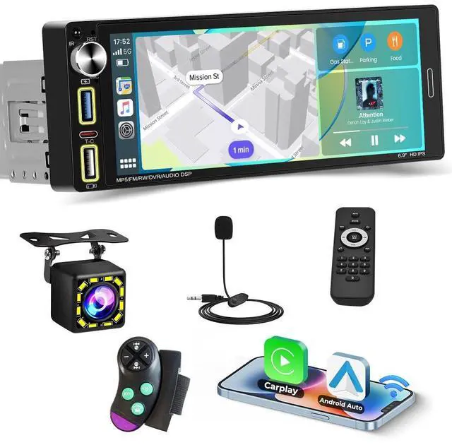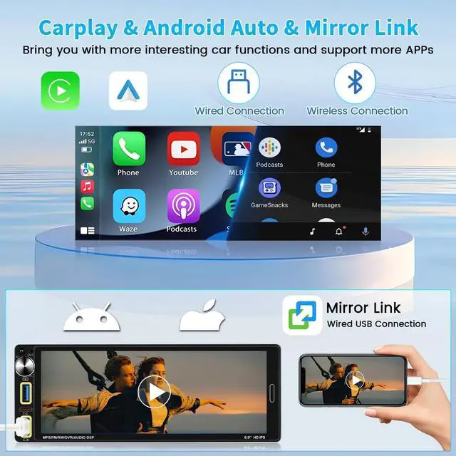 Android Auto]: With a single din car stereo system with wireless Apple CarPlay and Android Auto, Siri or Google will become your personal assistant on the go, helping you make/return and listen to voice messages, send/read and reply to text messages, access your favorite music and song information, and find the fastest route to your destination on your Apple car stereo system ^^ [HD touchscreen and