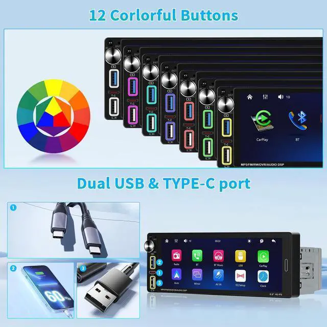 Backlight Settings]: Support Dual USB Input, Type C, offering easy and versatile connectivity. Charge your devices quickly, access your media library effortlessly, and enjoy uninterrupted entertainment on the go. The car's onboard buttons transformable lighting adds a touch of magic to your driving experience. The colors shift and dance, creating an atmosphere that is both stylish and captivating. ^^ [Support Backup