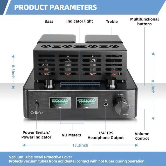 True HI-FI Tube Amplifier: CR666 is a Class A/B power amplifier that utilizes the classic circuit design of a vacuum tube preamplifier, which means you can hear the tiniest of details in your music while still getting warm, pure hi-fi sound quality and responsive dynamic response for a better listening experience with your speakers and headphones ^^ Integrated Stereo Power Amplifier with