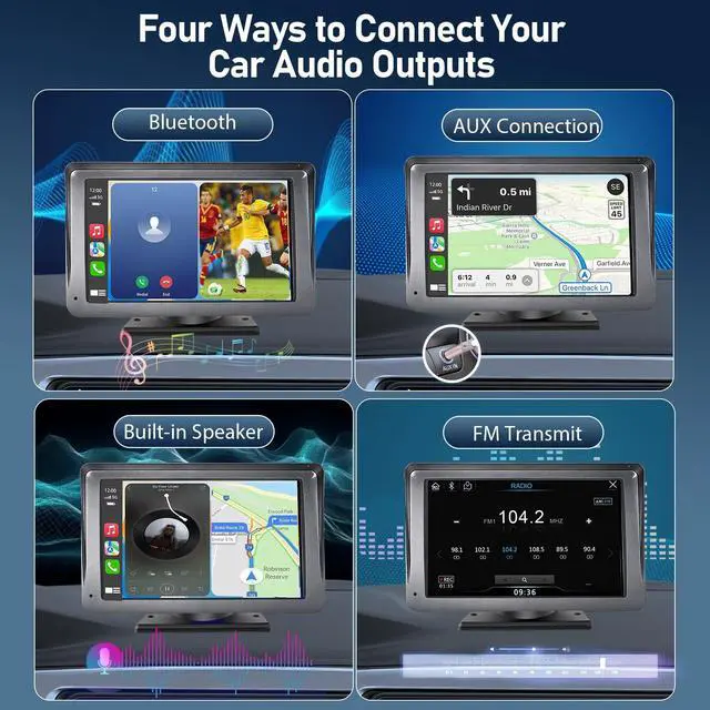 This upgraded, full HD touchscreen car stereo offers higher sensitivity, richer colours and a clearer display for the ultimate visual and audio experience. ^^ Multiple Audio Output ModesThe portable CarPlay screen has Bluetooth and built-in speakers, as well as AUX and FM transmitter audio output options. You can use the Bluetooth connection to play sound through the built-in speakers of the CarPlay stereo, as well as to make and receive hands-free calls and play music. Alternatively, you can play audio through the car's original sound system via the AUX or FM radio options.