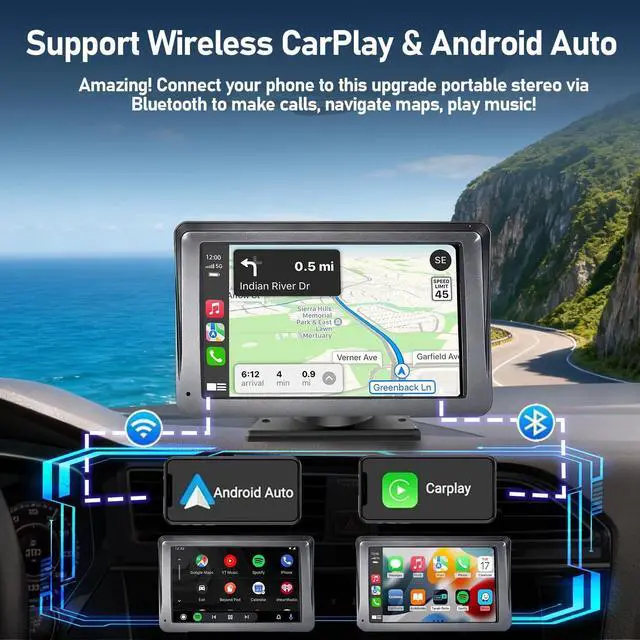 It's a smarter, safer and more fun way to use your phone in the car, keeping you focused, connected and entertained. ^^ GPS Navigation & WiFi Connection7 inch HD apple carplay touch screen provides precise real-time GPS navigation without delay. The voice-guided navigation through your car's portable wireless car audio speakers ensures safe driving and provides route suggestions for traffic jams and lane changes. Once connected to WIFI/hotspots, you can enjoy online navigation, watch videos, listen to podcasts and more. ^^ Wireless Mirror Link & 7'' HD Touchscreen This wireless Apple CarPlay stereo screen is compatible with both Android and iOS devices and features a 7-inch HD 1024 x 600p touchscreen, making it perfect for syncing your media player and navigation system.
