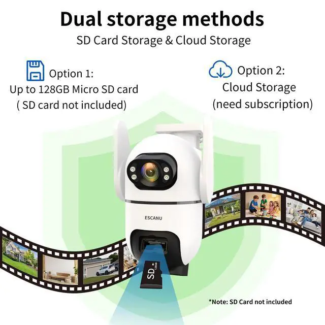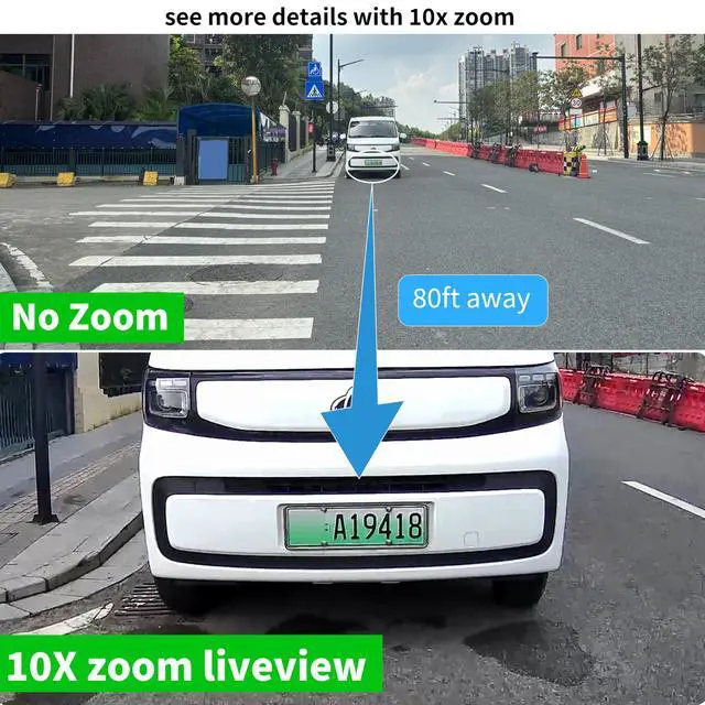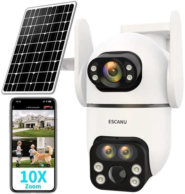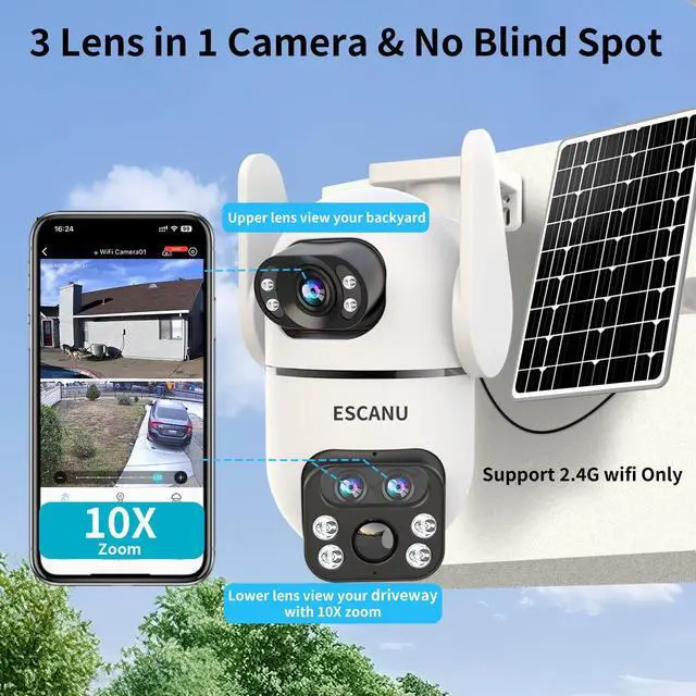 Three Lens Dual Views and 10X Hybrid ZoomThis solar security cameras outdoor featured with three lens dual view. The panorama camera has a wide-angle feld of view, you could view every corner of your front door, back yard, shop, garage. And the PTZ camera can be rotated to pan 355 and tilt 90. The security cameras wireless outdoor is equipped with 10X Hybrid Zoom, so you can see the details more clearly 65ft far away. ^^ Easy Use &100% Wireless& Support 2.4GT his outdoor camera comes with solar panel, rachargeale battery and built in wifi.