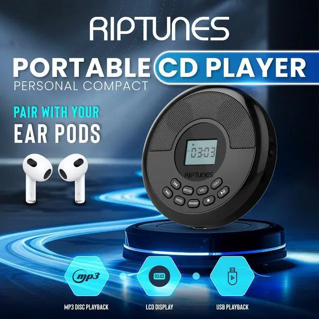 The Ultimate "All-in-One" Portable Music Player The Riptunes Portable CD Player redefines music devices by adding modern power features: Dual Stereo Speakers, Bluetooth Connectivity, and USB Playback. Listen Out Loud Dual Stereo Speakers You are no longer tied to headphones. This model is equipped with high-quality Dual Stereo Speakers, letting you fill your personal space with rich audio. It is perfect for listening to audiobooks at home, sharing music with friends, or relaxing without earbuds. Modern Connectivity Bluetooth & USB Bluetooth Transmit & Receive: Wirelessly pair the player with your modern Bluetooth earbuds for a cord-free experience, OR connect your smartphone to the player and use it as a Bluetooth speaker.