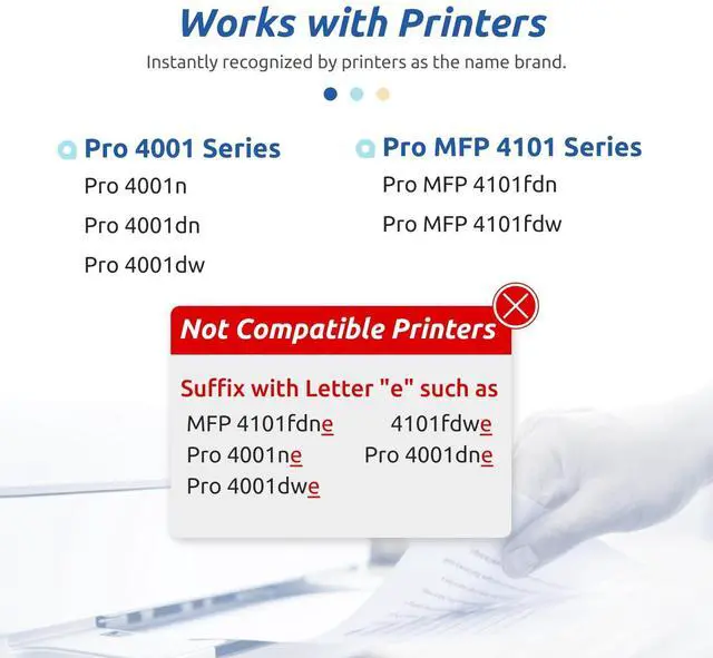 • Important Note: This product is not compatible with HP Pro 4001ne, 4001dwe, 4001dne, MFP 4101dwe, 4101fdne, 4101fdwe printers. Please confirm your printer model before placing an order.