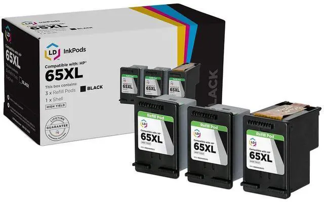Product name: 65XL 65-XL 65 XL Black ink cartridge inkpod pack compatible replacement for hp in 65, 65XL ink cartridges (N9K04AN) ^^ Professional compatible replacements manufactured by LD Products. HP is a registered trademark of HP and is not affiliated with and does not endorse LD Products.