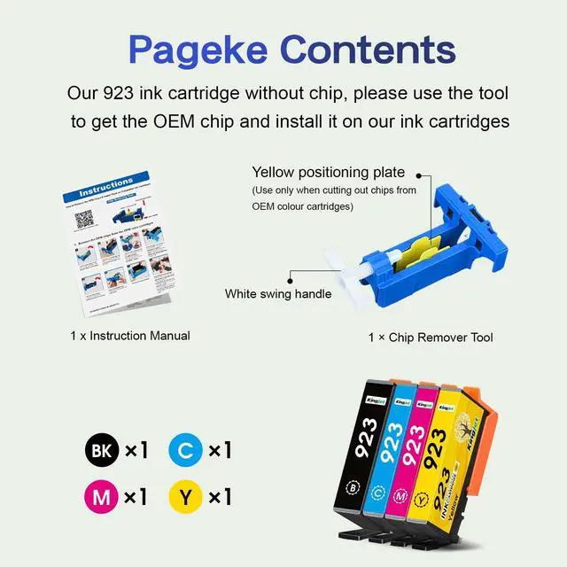 ^^ High Yield: 500 Pages per compatible for hp 923 black ink cartridges, 400 Pages per 923 color ink cartridge (based on 5percent coverage). ^^ How to Remove the OEM Chips & Install Them on kingjet 923 Ink CartridgesYou need to remove the original chips on ink cartridges through our tool. Peel off the tape of the new compatible cartridge and Stick the chip onto the tape. TipPlease follow the steps in the attached picture A+ or video for chip removal and installation, please contact us. if you have any issue during the removal and installation process.