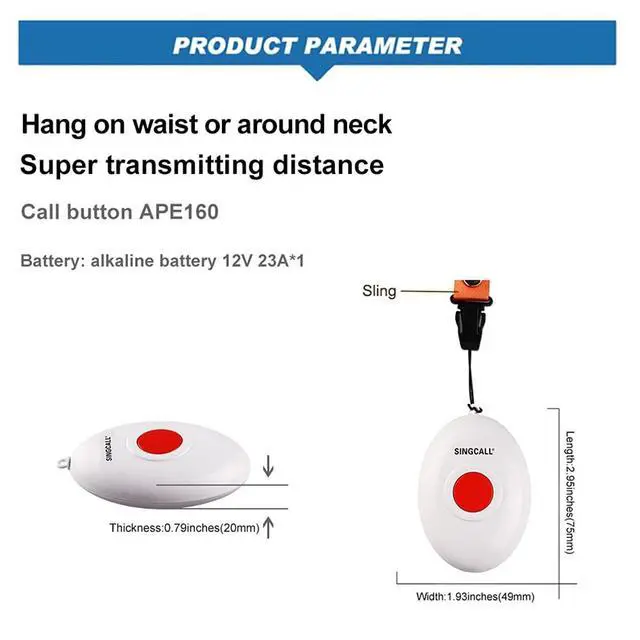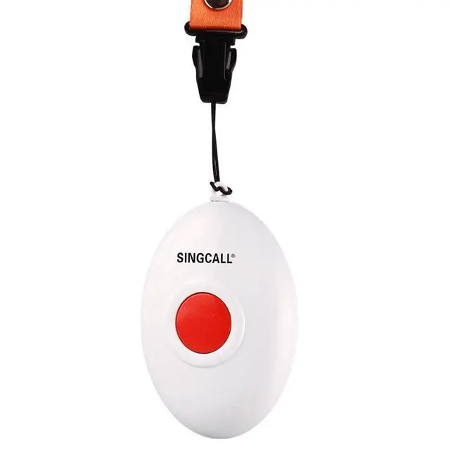 1. Rounded and light, comfortable to wear Oval rounded shape with lightweight, comfortable to wear ^^ 2. Dual hanging, easy to move Taking hang rope and suspension clasp as the wearing style, thus it could be hung around the neck or fastened on the waist. It is SINGCALL first kind of movable bell and is suitable for specific persons ^^ 3. Marked button, convenient to call Marked orange button makes the calling more convenient and it is not only fit for such kind of people, old, patients or children, but also suitable to patrol officers' calling ^^ 4.