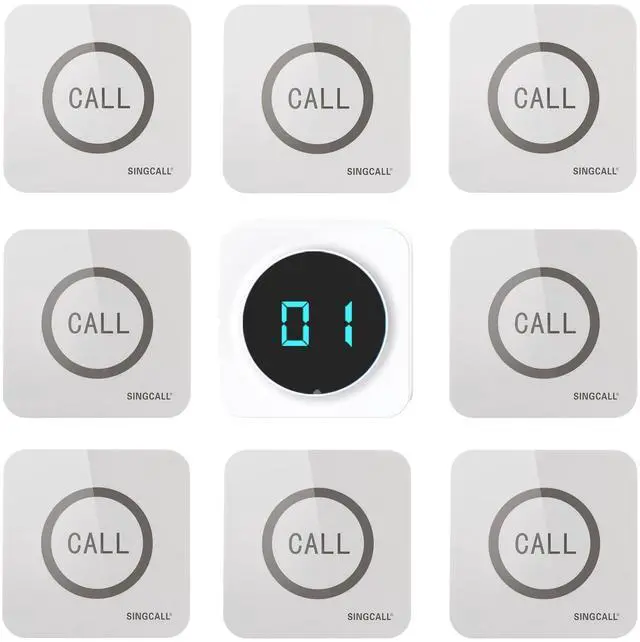 SINGCALL Restaurant Pager System Waiter Calling System Pagers and Beepers for Kitchen,Fast Food,Hotel,Restaurants,Cafe,Bar to Call Waiters 8 Waterproof Wireless Call Buttons 1 Number Display Receiver