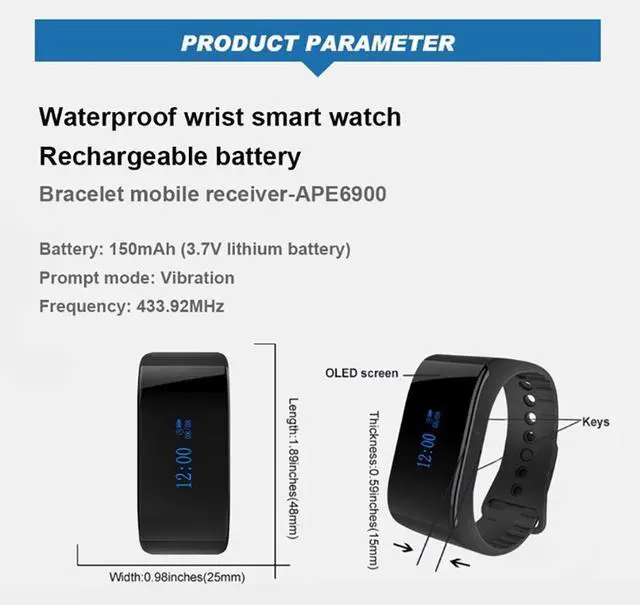 Mobile Watch Receiver: 01. The mobile watch receiver is Waterproof. 02. Has calendar, clock and alarm clock function. Rechargeable battery, 5 days standby time ^^ 03. With fast delete function, it can delete one registered number or all registered numbers with only one key. 04. Can download the registration information by charged software, makes the registration easier ^^ 05. With encryption function, avoiding the information lost by mistake operation. 06. OLED screen, thinner, lighter and more flexible anti-seismic and knock ^^