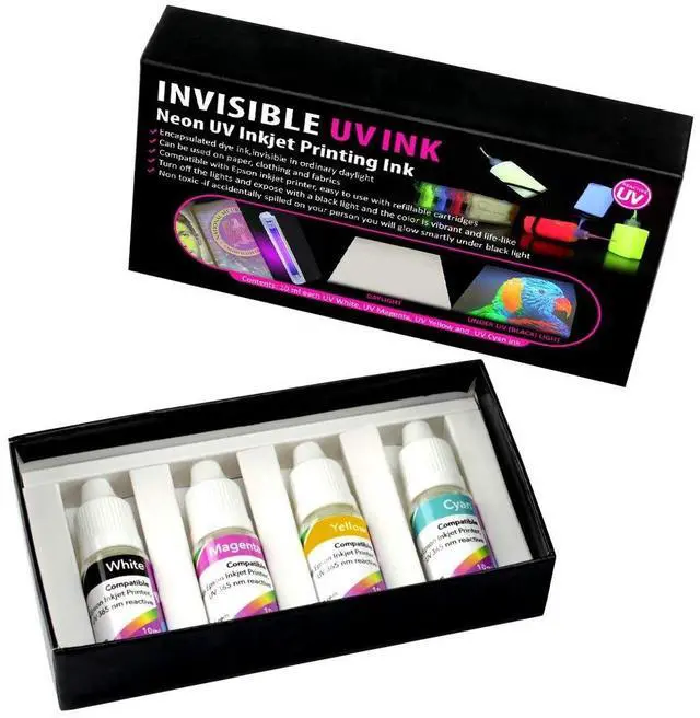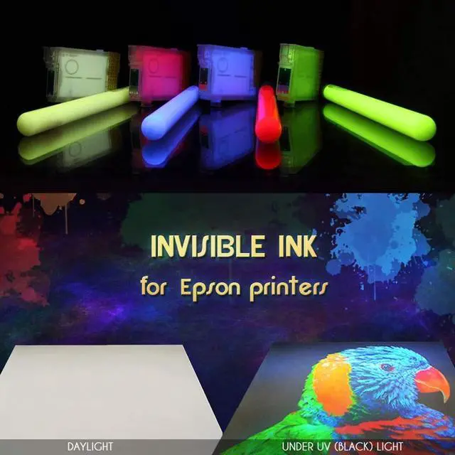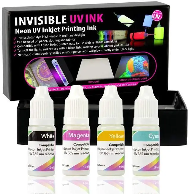 Invisible ink for inkjet printers that use "micro Piezo" printhead please ask us about compatibility before you purchase this item. The 4-color set contains the invisible white ink (for Black), Magenta, Cyan and Yellow. This ink is for printers is specially designed for perfect compatibility with inkjet printers for printing pictures, text, images, invisible to the naked eye. An ultraviolet light can make the picture, image or text printed with this ink look as though it were a miracle. This invisible ink has properties that allow it to withstand exposure to sunlight (not losing intensity), water and heat (will not evaporate).