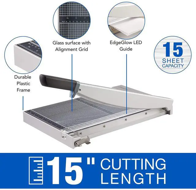 Take the guesswork out of trimming with the Swingline ClassicCut Glass Guillotine Trimmer. With EdgeGlow LED illumination, its easy to align to your papers for a perfect cut. Simply lift the blade and line your paper up with the light guide for clear and accurate trimming. This trimmer has a thick, tempered glass surface and is printed with alignment guides to help improve trimming accuracy. The deep guillotine blade has a 15" cutting length and can trim up to 15 sheets at once. Plus, a safety latch keeps the blade in place when its not in use.