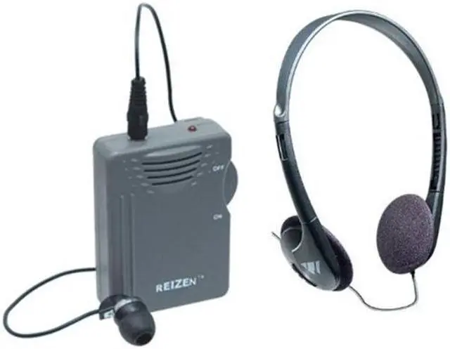 Powerful personal amplifier with 120dB gain; Built in microphone for clear and loud hearing; Voice and sound comes through mini earphone; Picks up sound at a distance of up to 100 feet away; Includes 2 AAA batteries, a single earphone, FREE pair of headphones
