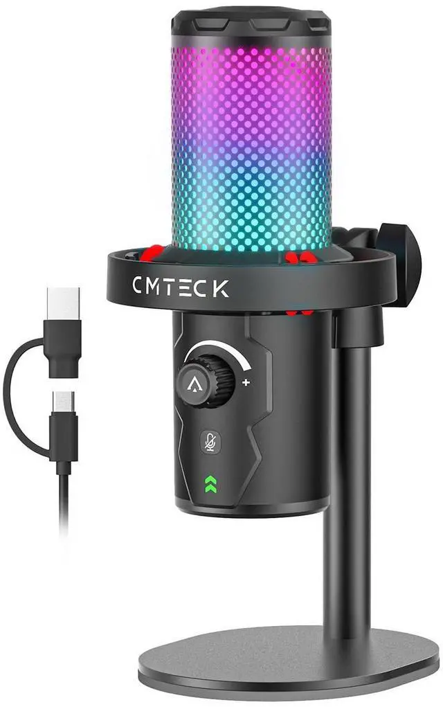 Touch the head of gaming microphone pc to cycle through 3 stunning modes: Single Color, Breathing Gradient and Dynamic Flowing Light. ^^ [Tap-to-Mute with LED Indicator]Instantly mute your pc microphone with a simple tap. The all-red lighting ensures you're always in control of your privacy. The intuitive LED indicator clearly shows your statusgreen for active, red for mute, so youre always aware of your status. Whether youre streaming, gaming, or on a call, stay in control of your privacy at all times. ^^ [Plug & Play]No driver needed. The computer mic works seamlessly with Windows, Mac, PS4, and PS5. Just plug it in and start recording or chatting right away. Enjoy zero-latency real-time monitoring for smooth, delay-free audioperfect for streaming, podcasting, gaming, recording, or virtual meetings. ^^ [Detachable Aluminum Base and Stand]Far more durable and stable than common plastic alternatives. Our sleek, detachable aluminum base offers superior stability, leaving flimsy plastic mounts in the dust. The included adapter fits both 3/8" and 5/8" threaded mounts for maximum flexibility. ^^ [Excellent Service & Superior Guarantee]CMTECK USB microphone undergo rigorous quality control processes to ensure product quality.