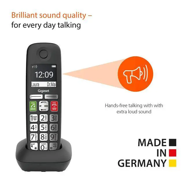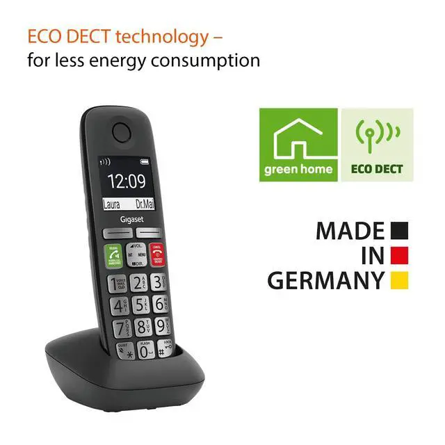 EASE OF USE - The Gigaset E295HSB has an ergonomic Keyboard - Large 2" Black/White Display with stark contrasts and illumination - Big font sizes for improved readability ^^ STRONG FUNCTIONALITY - Brilliant HD Audio Quality due to the HDSP-Technology - Local Call Block for 20 numbers - Up to 100 Contacts - 14h talk time and 180h Standby time - Range of 164 inches indoors. ^^ QUICK INSTALLATION - Connect the additional handset to the base station via the pinging button and start calling straight away - A detailed manual is available to download below and included in the delivery ^^ QUALITY MADE IN GERMANY - Designed and manufactured in Germany - the environmentally friendly ECO DECT technology ensures reduced energy consumption.