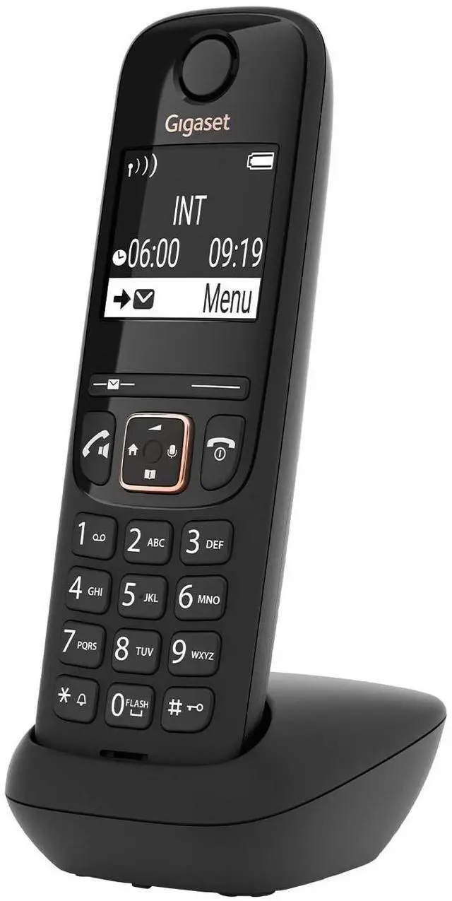 HIGH QUALITY - the ergonomic handset (metal dome technology) is very comfortable to use - with its high contrast 2" display everything is easy to read - with a stand bye time up to 180 hrs Durable ^^ BRILLIANT SOUND - Easy handsfree function allows to continue talking with brilliant HSP quality - the practical handset with an easy-to-use volume key makes every conversation pleasant ^^ DO NOT MISS A CALL - the Gigaset A694A has an answering machine with a recording capacity of up to 30min - in addition the phone has a call block - move the number from the call list to the blocklist ^^ QUALITY MADE IN GERMANY - Designed and manufactured in Germany - the environmentally friendly ECO DECT technology ensures reduced energy consumption.
