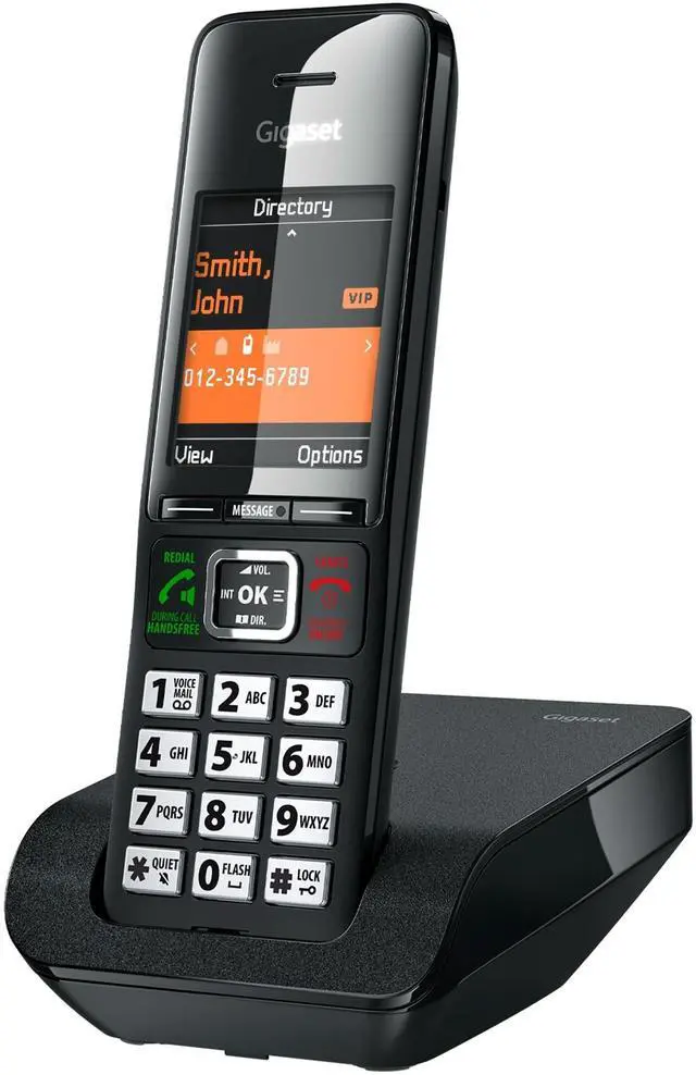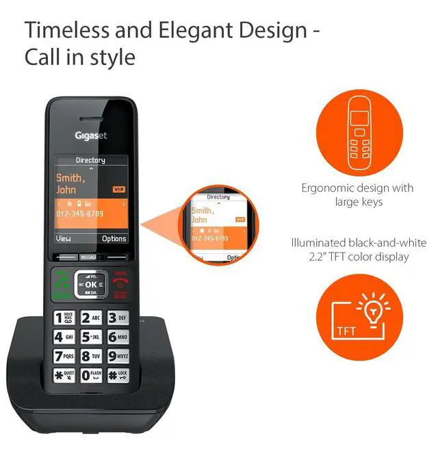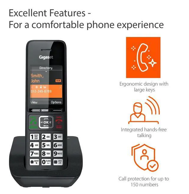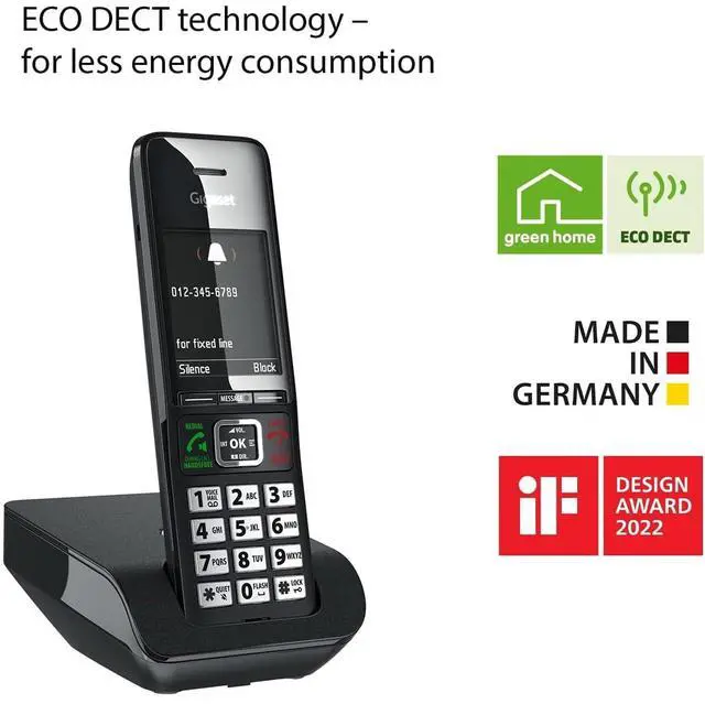 TECHNOLOGY MEETS DESIGN - The Gigaset COMFORT 552 impresses with its elegant, timeless design and 2, 2" color display - the ideal partner for your home, home office or office spaces ^^ CONVINCING FEATURES - Phone calls and hands-free talking in brilliant HD quality - Headset compatibility via 3, 5mm jack - Comfort call protection for 150 numbers - Address Book for up to 200 entries ^^ EASY INSTALLATION - simply connect the base station to the wall phone socket and start calling right away - you will benefit from a quick and easy setup of your new phone ^^ QUALITY MADE IN GERMANY - Designed and manufactured in Germany - the environmentally friendly ECO DECT technology ensures reduced energy consumption ^^ CONTENTS INCLUDE - 1x handset, 1x base station, 1x power adaptor, 1x telephone connection cable, 2x AAA rechargeable batteries, 1x beltclip, 1x short user guide