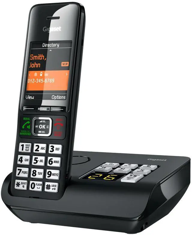 TECHNOLOGY MEETS DESIGN - The Gigaset COMFORT 552A impresses with its elegant, timeless design and 2, 2" color display - the ideal partner for your home, home office or office spaces ^^ CONVINCING FEATURES - Phone calls and hands-free talking in great quality - with answering machine - Headset compatibility - Comfort call protection for 150 numbers - Address Book for up to 200 entries ^^ EASY INSTALLATION - simply connect the base station to the wall phone socket and start calling right away - you will benefit from a quick and easy setup of your new phone ^^ QUALITY MADE IN GERMANY - Designed and manufactured in Germany - the environmentally friendly ECO DECT technology ensures reduced energy consumption ^^ CONTENTS INCLUDE - 1x handset, 1x base station, 1x power adaptor, 1x telephone connection cable, 2x AAA rechargeable batteries, 1x beltclip, 1x short user guide