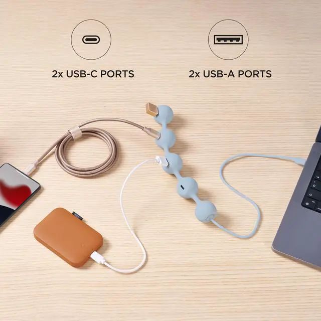 Here are some examples: mouse, power bank, phone, mini portable fan, lamp, wireless headset... and any other device with USB port. Say goodbye to messy cables and multiple adapters. The Peas HUB allows you to simultaneously connect up to 4 devices and charge them, so your devices are always ready to use, all in one convenient device. Designed to be both portable and durable, the Peas Hub is perfect for anyone who needs reliable performance on the go. Whether you're working in the office, coffee shop, or on a business trip, this compact hub is the perfect solution to stay connected without compromising performance or style.