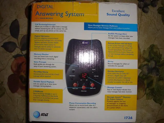 Enjoy all the convenience of dial-in remote access and none of the hassles of hissy, imprecise analog answering machines thanks to AT&T's compact and affordable 1726 digital answering system. It offers three separate voice mailboxes and is compatible with paid services like caller ID (announce, not display) and call screening/intercept. An extended record time of 40 minutes means you won't have to erase your messages just to have free storage space for new messages, and the device even lets you move messages between mailboxes for convenient file sharing with other household members. A two-digit message counter informs you of how many messages are currently in each mailbox.