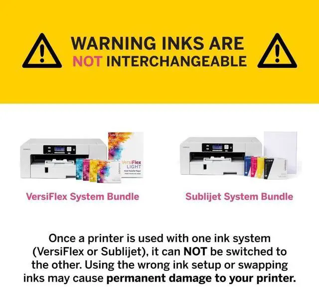 Exclusively designed for the entry-level professional, Sawgrass has you covered. ^^ Unleash Vibrant Colors & Soft Feel - VersiFlex Decoration Inks that deliver stunning, true-to-life colors with a soft touch. No more stiff, uncomfortable transfers for a professional finish - unlike DTF printing. ^^ Game-changing Innovation - VersiFlex 70910 inks exceed traditional sublimation ink. SubliJet and VersiFlex setups are not interchangeable. Using the wrong configuration may result in printer damage.