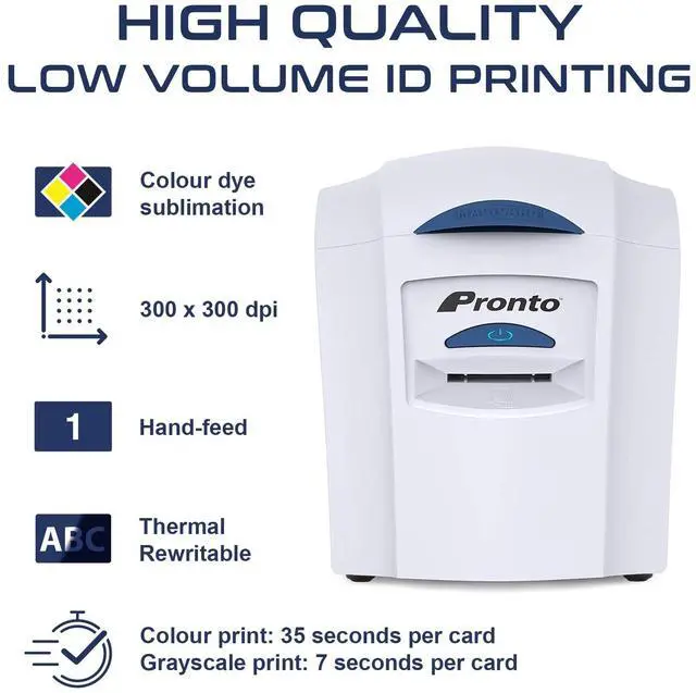 Excellent warrantyThe Magicard Pronto Single-Sided ID Card Printer is covered by a 2-year warranty. Ideal applications Employee ID cards for small businesses Membership ID cards Facilities access badges Loyalty or gift cardsMagicard Pronto Single Sided ID Card Printer SpecificationsPrinter specs: Technology 300dpi color dye sublimation, monochrome, thermal rewritableFeed system Manual fedPrinting capability