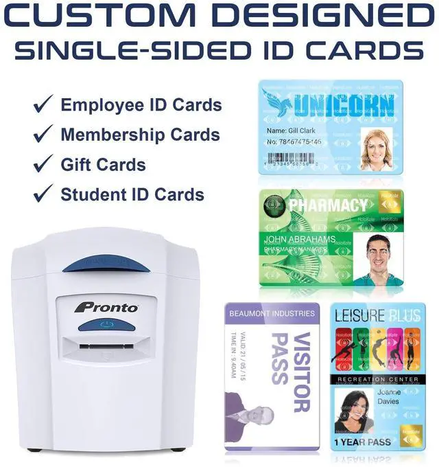 Magicard Pronto Single Sided ID Card Printer DescriptionIf you need an easy-to-use, single-sided, hand-fed ID card printer thats both compact and affordable, the Magicard Pronto Single-Sided ID Card Printer prints high-quality IDs with vibrant colors and crystal clear text. The Magicard Pronto also prints a unique watermark for identification and security purposes at no additional cost. PortableLightweight, yet sturdy, the Magicard Pronto Single-Sided ID Card Printer is easily transported from reception desk to office or from location to location. Perfect for events or use in the field, the Magicard Pronto Printer goes where you need it most.