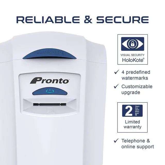 Card security featureIncluded with the Magicard Pronto Single-Sided ID Card Printer is the advanced Holo Kote, a patented technology that prints a secure watermark during processing. You can choose from 4 standard watermarks to customize your badges for visual security purposes. Ultimate versatilityYou get a versatile, single-sided printer that anyone can use. Simply power it up, easily install the driver, drop in the dye film, and start printing. The Magicard Pronto Single-Sided ID Card Printer prints both full color cards or thermally activated cards that can be printed, erased, and rewritten in monochrome.
