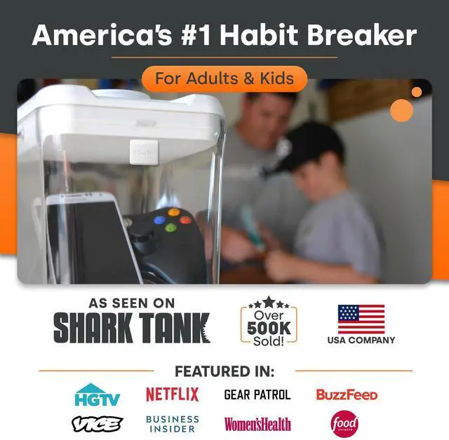 Lock it for anywhere from 1 minute to 10 days. No override feature to help you stay on track with your goals. The simple dial makes it easy to commit and stick with it. ^^ BUILT TO LAST. Made from thick, durable BPA-free plastic, our habit lock box features thick walls, a motorized lock, and a clear countdown timer. ^^ FEATURED ON SHARK TANK & TIME MAGAZINE. Called Brilliant by USA Today and TIME, our trusted commitment device has helped over 20, 000 people break their stubborn bad habits.