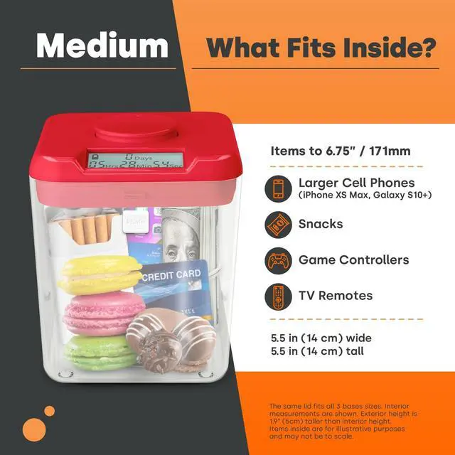 LOCK AWAY DAILY DISTRACTIONS. Put away the vices stealing your attention, including phones, wallets, snacks, or credit cards. This time locking container helps you stay present and follow through on your goals. ^^ SPACIOUS FOR EVERYDAY VICES. Our medium size holds most phones, snack packs, credit cards, and small electronics. Its perfect for work desks, kitchen counters, or shared spaces. Use it as a phone lock box or snack safe to reduce screen time and cravings. ^^ SET YOUR TIME, PRESS THE BUTTON.