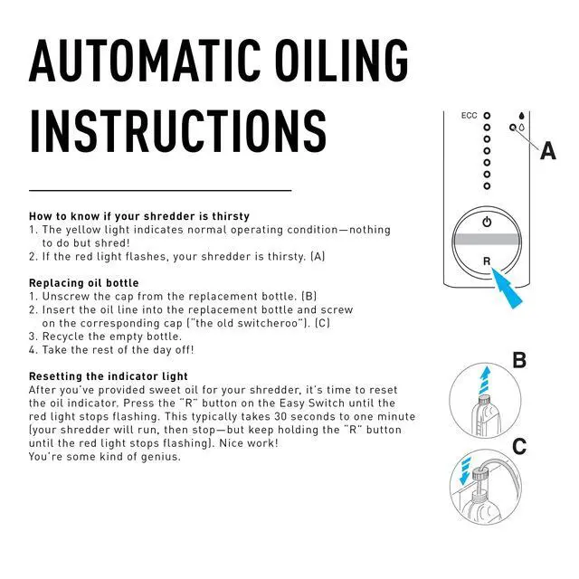 FREQUENCY: The oil should be used on shredder blades for every 30 minutes of operation for cross-cut shredders, and for every hour of operation for strip-cut models