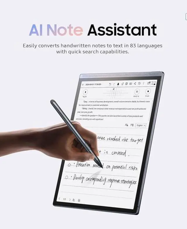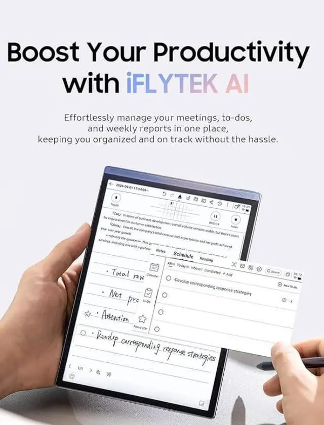 Enjoy an immersive view with an impressive 88.5 % screen-to-body ratio, perfect for seamless creativity and productivity The Revolutionary Note Handwriting to Text Handwritten notes can be searched, and are automatically converted to text, making your content easy to find Cloud Sync Secure cloud sync with Doxent App for multiple devices access ensuring your notes are never lost Take Your Writing Experience Further Smart Schedule System With iFLYTEK AINOTE Air 2 you can draw a star next to the handwriting option to mark it as a notable feature. Also you can draw a circle around it to mark it as a to-do in your schedule Smart Task Alerts Stay on top of your day with easy task viewing and pop-up notifications to remind you of upcoming tasks Smart Quick Bar Use the Fast Page Flipping function from the Quick Bar to quickly navigate through eBooks, enhancing your reading experience