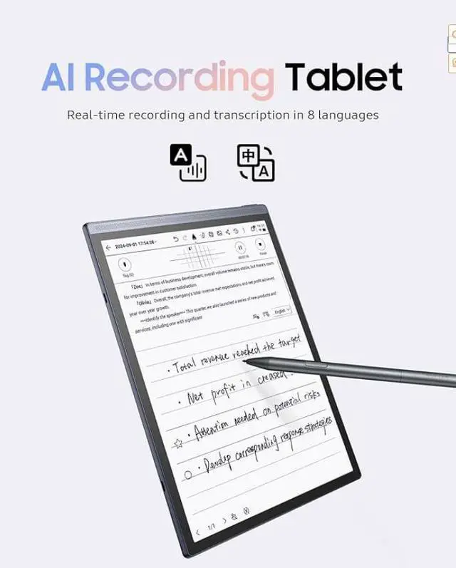 oice, Paper and eReader - All in one Easily apply to simplify your workflow and boost productivity effortlessly Voice-to-Text Effortlessly record meetings and convert voice to text in real time. AINOTE Air 2 simplifies taking accurate and instant meeting memos Writing & Voice Sync AINOTE Air 2 lets you handwrite while converting voice to text. It's time to blend traditional notes with iFLYTEK AI technology Support up to 14 Languages AINOTE Air 2 enhances productivity by offering real-time translation and transcription during meetings, allowing you to capture and organize important information effortlessly. 14 Languages for Transcription English, Japanese, Korean, French, German, Spanish, Cantonese, Russian, Malaysian, Vietnamese, Arabic, Thai, Indonesia, Chinese 7 Languages for Translation English, Japanese, Korean, French, German, Spanish, Chinese Immersive Paper-Like Experience Experience ultimate paper-like writing with ultra-low latency on a large 8.2 -inch screen.