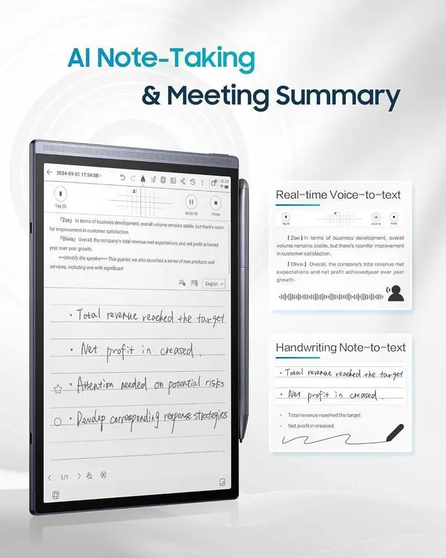 ^^ Powered by ChatGPTWith built-in ChatGPT, tackle study notes, meeting summaries, and writing tasks more efficiently. Get instant help organizing ideas, clarifying content, or drafting polished textall from this digital notebook. ^^ AI Notetaker & Schedule ManagementMark up handwriting supernote effortlessly with special star, triangle, and circle symbols using the stylus pen to automatically create to-dos and attention items. Manage your personal schedule and display weekly work reports with ease. A perfect gift for friends, colleagues and client. ^^ Cloud Sync with One DriveThis electronic notebook with pen features secure cloud sync and integration with Google Play, enabling access across multiple devices and safe storage of historical notes, ensuring your work is never lost.