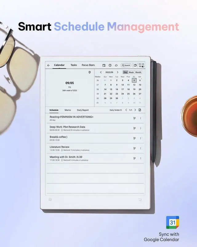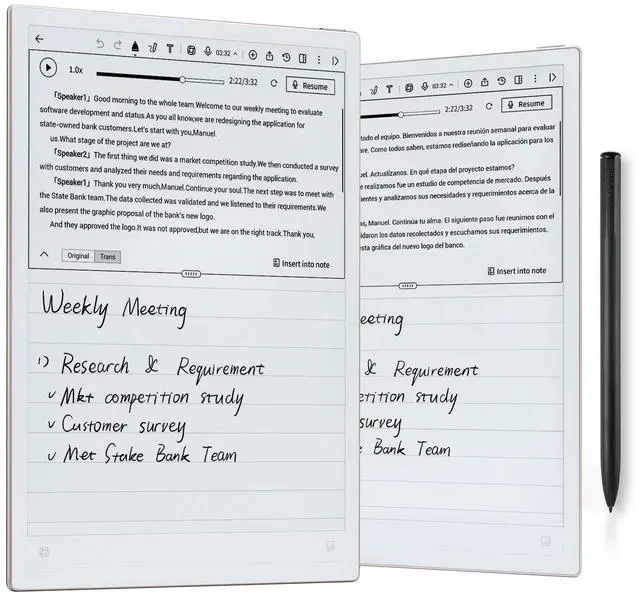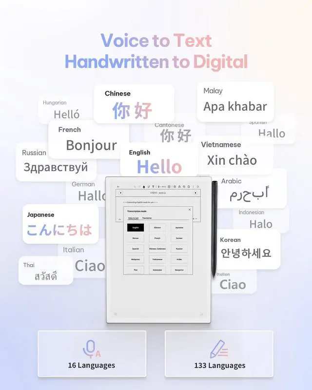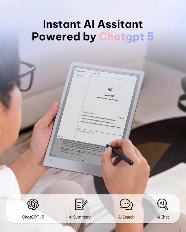 Built-In AI Assistance Simply circle any handwritten or printed text to get instant answers powered by ChatGPT-5, solving questions on the spot without breaking your workflow. ^^ 16-Language Real-Time TranscriptionCapture every word in meetings, lectures, or brainstorming sessions with professional-grade accuracy across 15 languages, so you stay focused on ideasnot typing. ^^ Paper-Like Writing & Versatile ReadingSix refined brush styles mimic real handwriting with natural resistance and pixel-perfect precision. Enjoy smooth, eye-friendly reading with fast refreshcompatible with Kindle, Kobo, and Google Play apps. ^^ Seamless Google Calendar SyncEffortlessly connect AINOTE 2 with Google Calendar to keep schedules updated across devices.