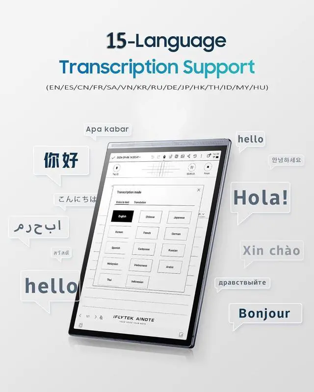 AI Note-Taking & Meeting SummaryiFLYTEK AINOTE Air 2 AI Paper Tablet AlNOTE Air 2 offers real-time voice-to-text translation, Al meeting summaries, and smart schedule management - all in one device. The writing tablet for adults supports voice transcription in 15 languages (En/Es/Zh/Fr/Sa/Vn/Kr/Ru/De/Jp/Hk/Th/Id/My/Hu), mutual translation in 10 languages(Zh, En, Hu, Ja, Ko, Fr, De, Es, Ar, Ru), and continues to expand language support for global users. ^^ Paper-like Writing-AlNOTE Air 2 paper tablet is equipped with a stylus pen and an 8.2 '' e-ink screen with a paper-like writing experience, 23ms low latency and supports handwriting recognition in 83 languages and converts them into text.