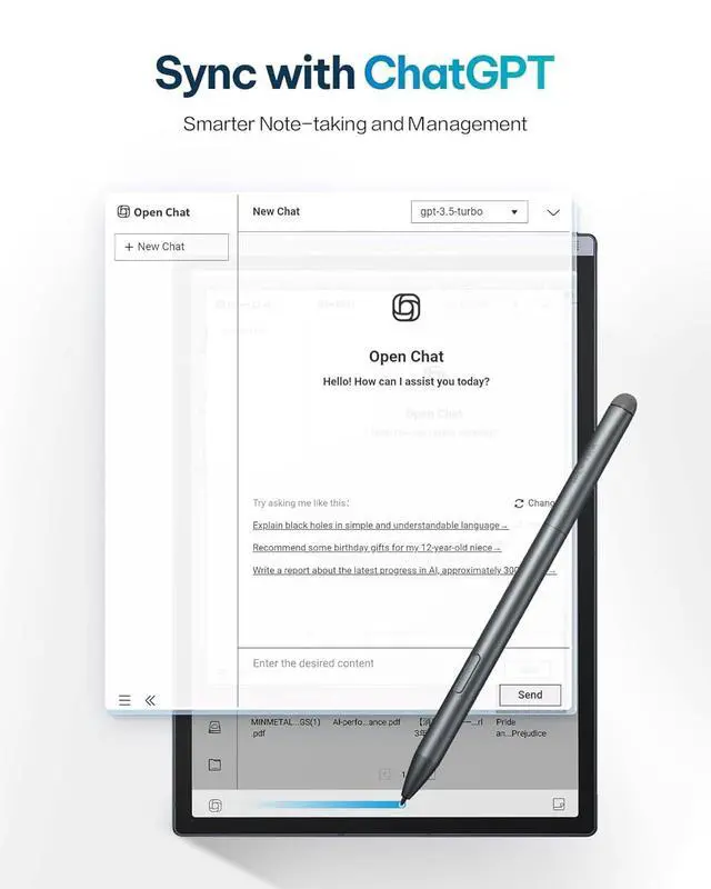 v ^^ Powered by ChatGPTWith built-in ChatGPT, tackle study notes, meeting summaries, and writing tasks more efficiently. Get instant help organizing ideas, clarifying content, or drafting polished textall from this digital notebook. ^^ AI Notetaker & Schedule ManagementMark up handwriting supernote effortlessly with special star, triangle, and circle symbols using the stylus pen to automatically create to-dos and attention items. Manage your personal schedule and display weekly work reports with ease. A perfect gift for friends, colleagues and client. ^^ Cloud Sync with One DriveThis electronic notebook with pen features secure cloud sync and integration with Google Play, enabling access across multiple devices and safe storage of historical notes, ensuring your work is never lost.