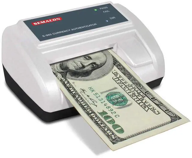 Semacon S-960 Series 900 Compact Automatic Currency Authenticator With SmartCert Technology, And AC or Battery Operation, 80 Banknotes Per Minute SpeedThe Semacon S-900 Series Compact Automatic Currency Authenticators feature a simple Pass/Fail indicator and eject direction control in a durable compact space-saving design. Feeding a bill into the machine is done quickly and easily, followed by an immediate indication of the authentication resultsKey