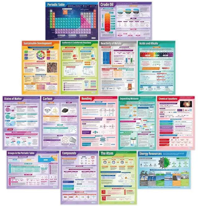 • EDUCATIONAL CHARTS DESIGNED BY TEACHERS: Our set of 15 Chemistry posters help students to learn, engage and remember more information than ever before. Covering a range of core topics, these unique school posters can play a vital role in improving both students' understanding and classroom decor.
